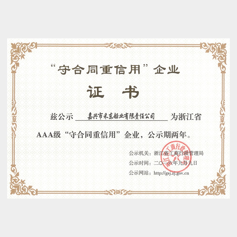 公司具備鋼質(zhì)船舶制造企業(yè)二級∥類、鋁質(zhì)船舶制造企業(yè)三級和纖維增強塑料船舶制造企業(yè)二級類資質(zhì),擁有中國船級社認證公司認證的IS09001質(zhì)量管理體系、ISO14001 環(huán)境管理體系認證證書和OHSAS18001職業(yè)健康安全管理體系和按照國家相關(guān)標準建立的安全生產(chǎn)標準化三級體系。